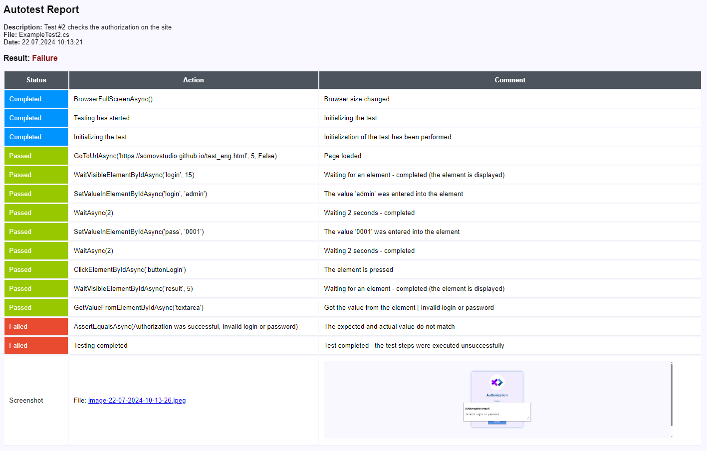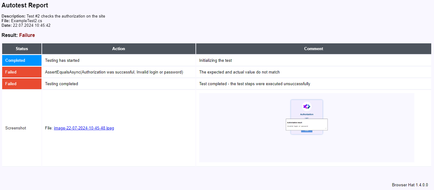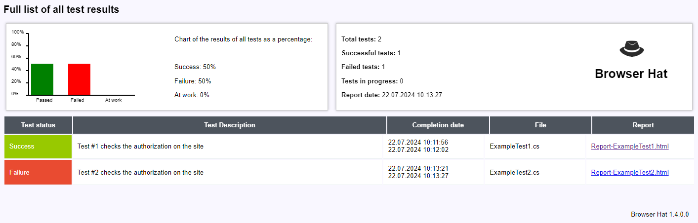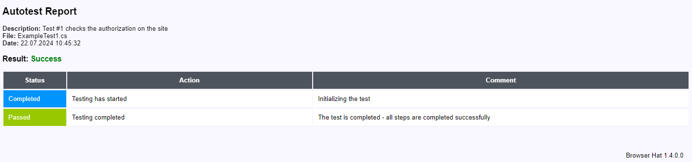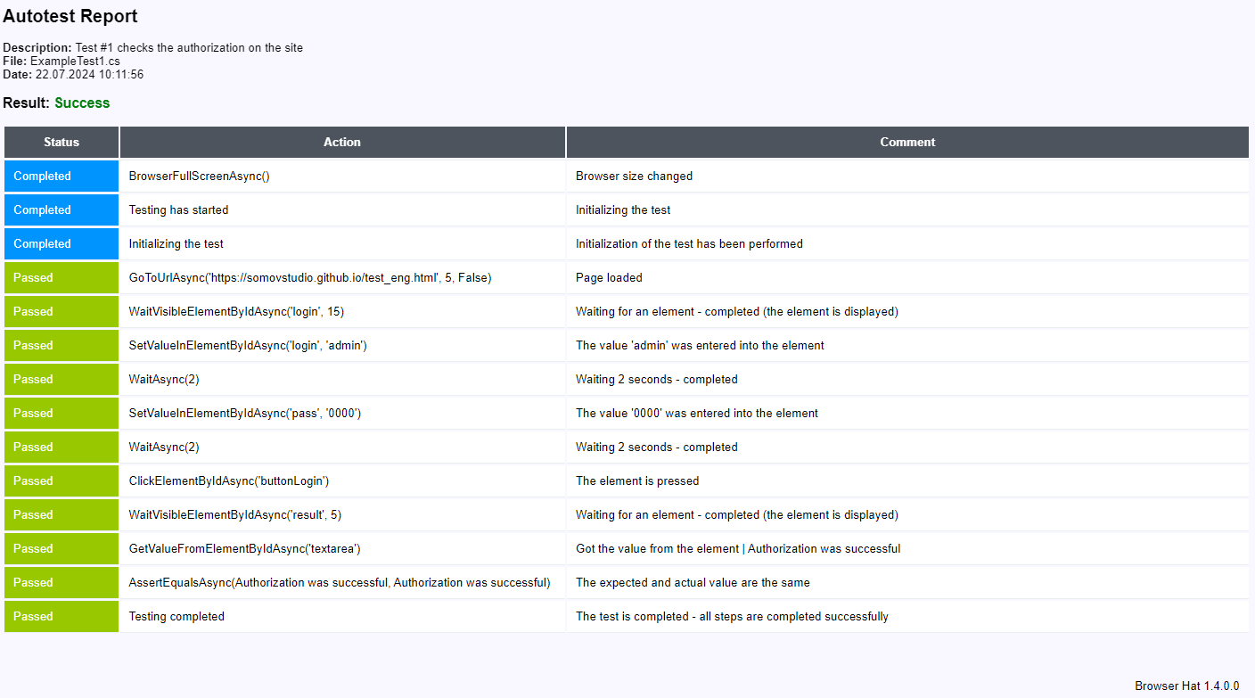 For example, when performing the ExampleTest1.cs autotest, a report will be created with the name Report-ExampleTest1.html