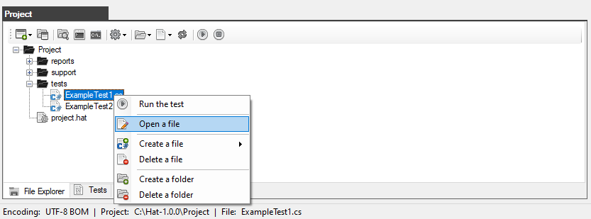 To open a file with the *.cs extension in the editor, you need to double-click on the desired file in the Project window (on the Explorer tab) or open the context menu and select "Open file".