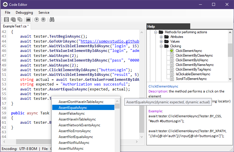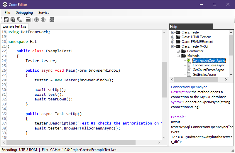 An editor with keyword highlighting, as well as reference information about the built-in methods of the Net Framework framework.