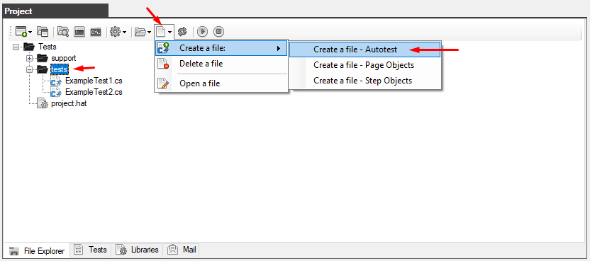 To create a new autotest, you need to select the folder in which you want to create the file in the "Project" window (on the "Explorer" tab), then click on the "Files" button to open the menu and select "Create Autotest file"