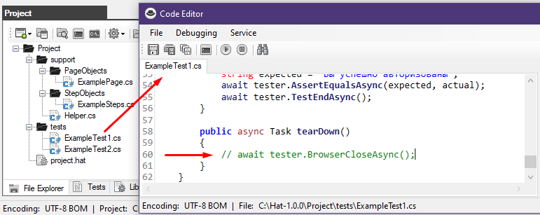 In line 60, a line is commented out with a call to the BrowserCloseAsync() method that closes the browser.