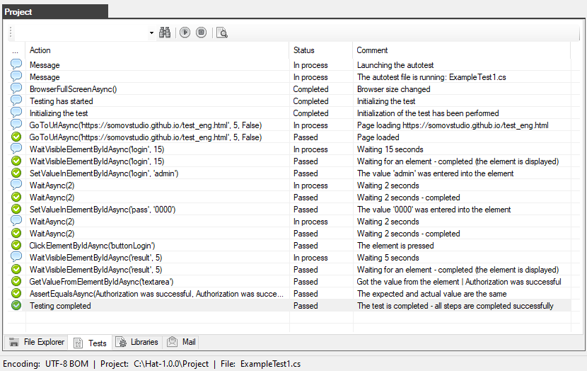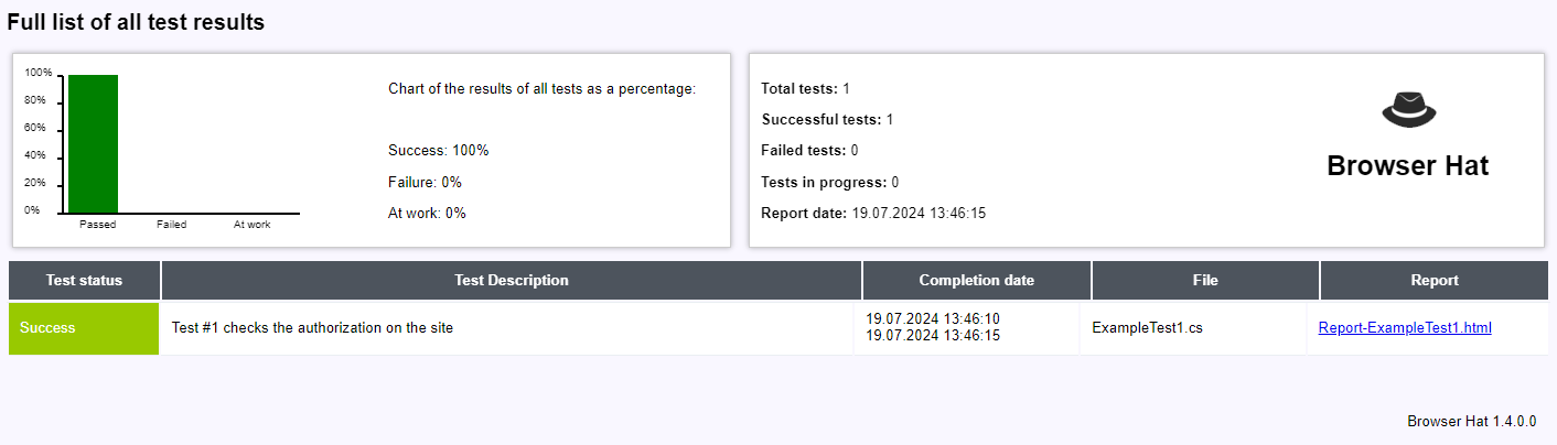 Double-clicking on the report file (for example: index.html or Report-ExampleTest1.html) you will receive a report with a full description of the progress of the autotest.