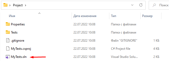 Then double-click on the file with the *.sln extension (in this case, MyTests.sln)