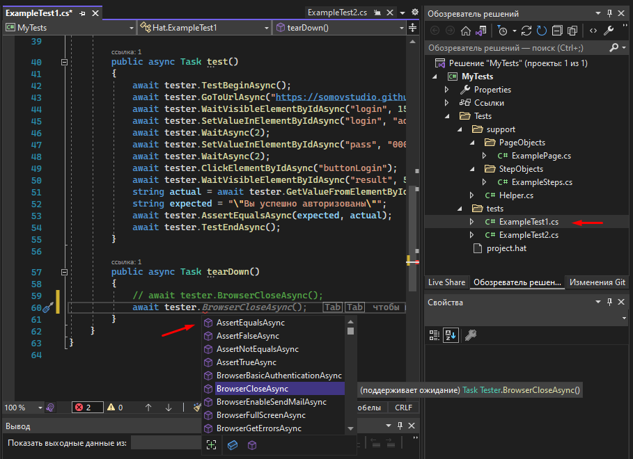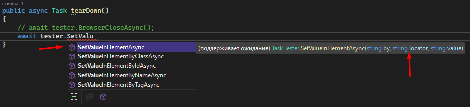 It is very convenient to use Visual Studio because the editor, when entering, shows a drop-down list with all available methods, as well as shows the syntax of the selected method and the variables required by it.