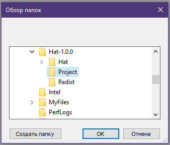 In this case, the Project folder has been created at C:\Hat-1.0.0\