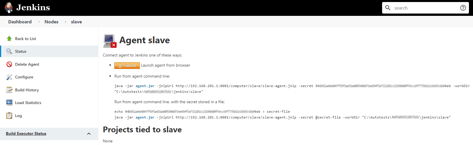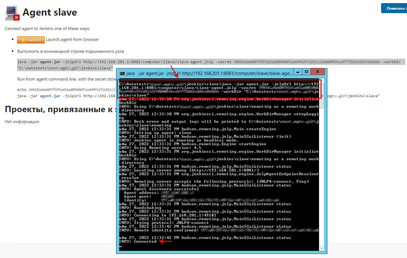 java -jar agent.jar -jnlpUrl http://192.168.201.1:8081/computer/slave/slave-agent.jnlp -secret aaaaaaaaaaaaabbbbbbbbbbbbbccccccccccccccccdddddddddddd -workDir "C:\Autotests\#########\jenkins\slave"