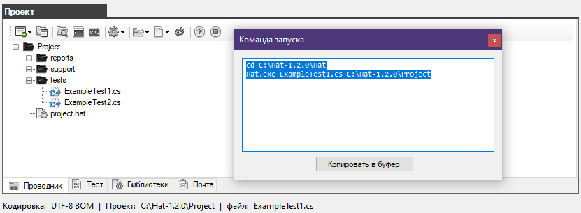 Затем в поле "Command" вставьте команду запуска автотеста полученную из браузера Hat.