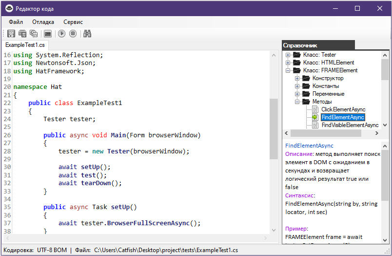 Редактор с подсветкой ключевых слов, а так же справочной информацией о встроенных методых фреймворка HatFramework.