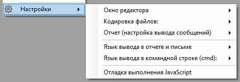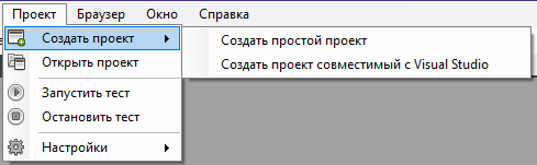 Меню "Проект" - создание и открытие проектов автотестов, выполнение и остановка автотестов, а так же настройки.