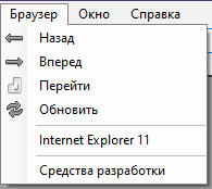 Меню "Браузер" - служит навигацией браузера, а так же позволяет открыть панель разработчика "Средство разработки" и открыть окно Internet Explorer 11