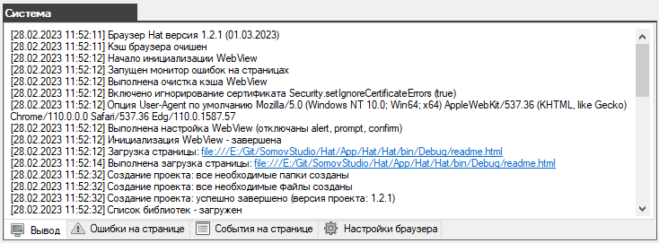 Вкладка "Вывод" - отображает все события происходящие при работе приложения.