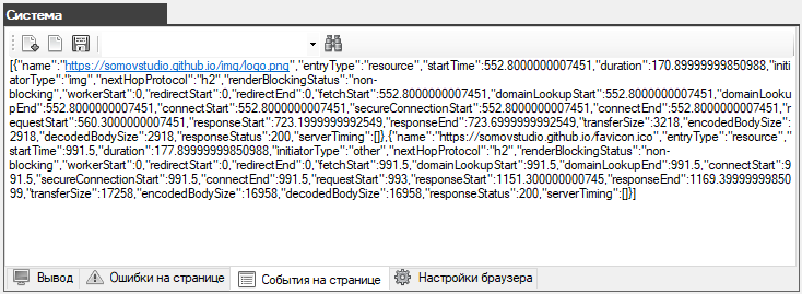Вкладка "События на странице" - отображает все события (network) происходящие на загруженных страницах.