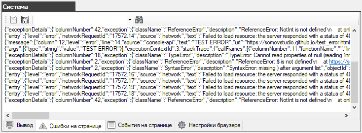 Вкладка "Ошибки на странице" - отображает все ошибки (console) происходящие на загруженных страницах.