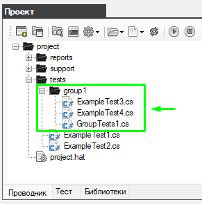 Теперь нужно создать объединяющий автотест GroupTests1.cs который будет вызывать другие автотесты.