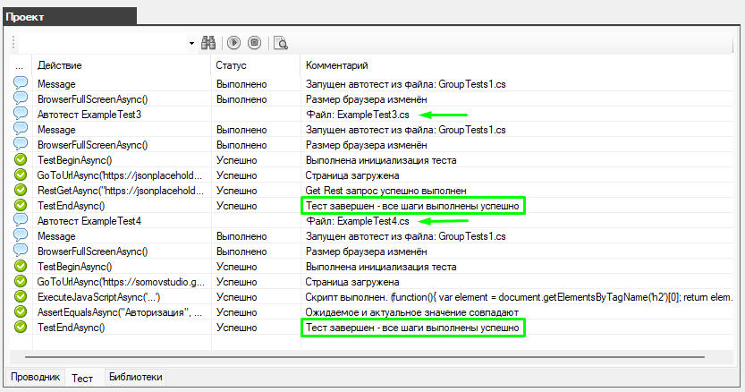 В результат на вкладке "Тест" будет отражен весь ход последовательного выполнения всех автотестов шаг за шагом.