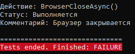// Функция завершения работы с автотестом public async Task tearDown() { await tester.BrowserCloseAsync(); // Закрывает браузер } } } |