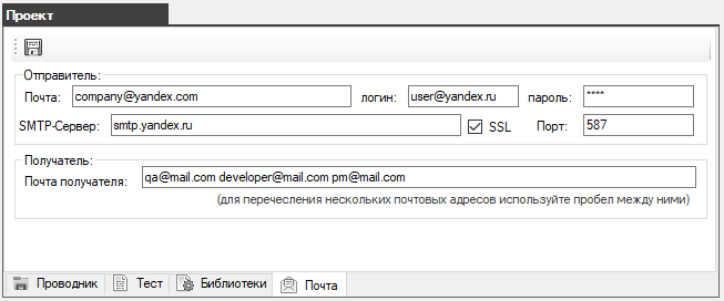 В окне "Проект" настраивается подключение к почтовому серверу.