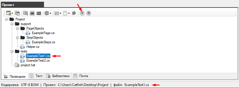 Чтобы запустить автотест нужно его выбрать в папке tests и нажать на кнопку "Запустить тест"