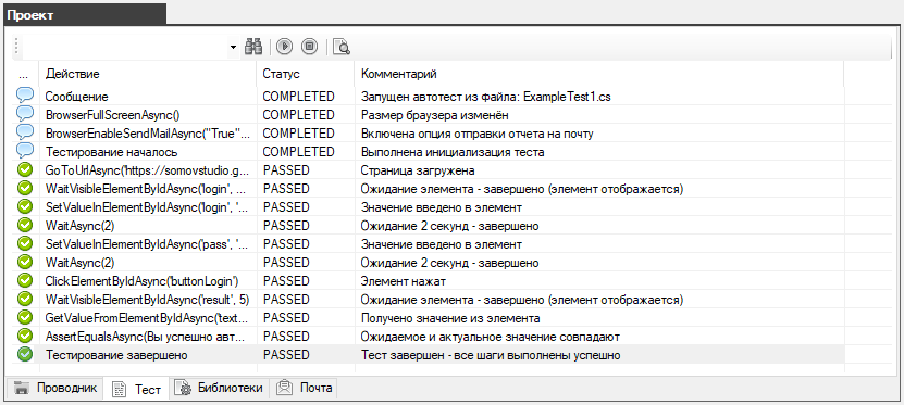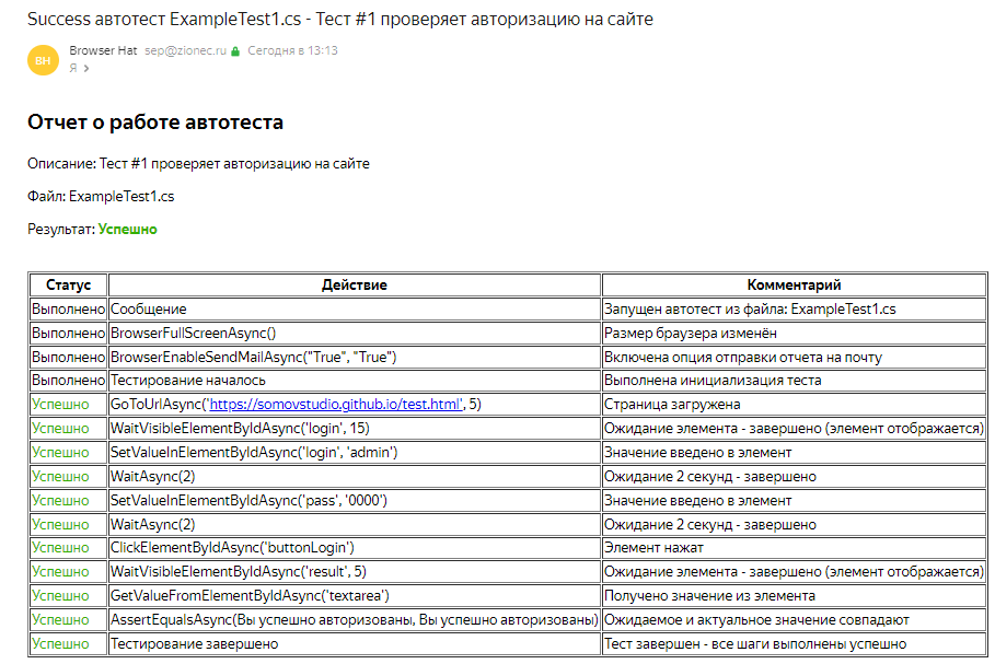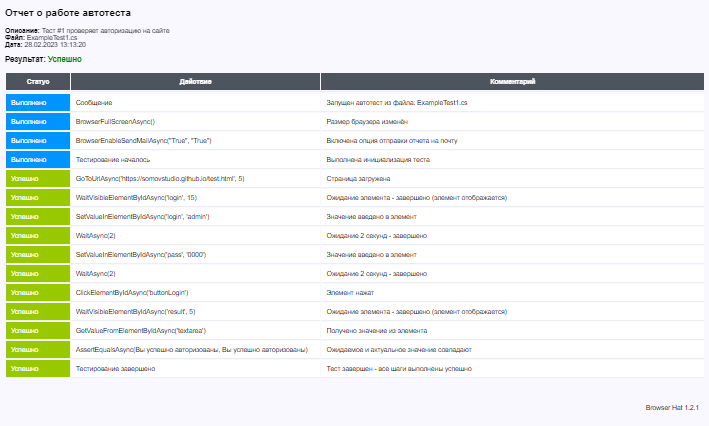Нажав дважды на файл отчета (например Report-ExampleTest1.html) вы получите отчет с полным описание о ходе выполнения автотеста.