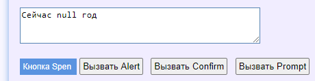 Затем автотест нажмет кнопку "Вызвать Prompt", при этом диалоговое окно не откроется, а в поле сразу появится сообщение "Сейчас null год"